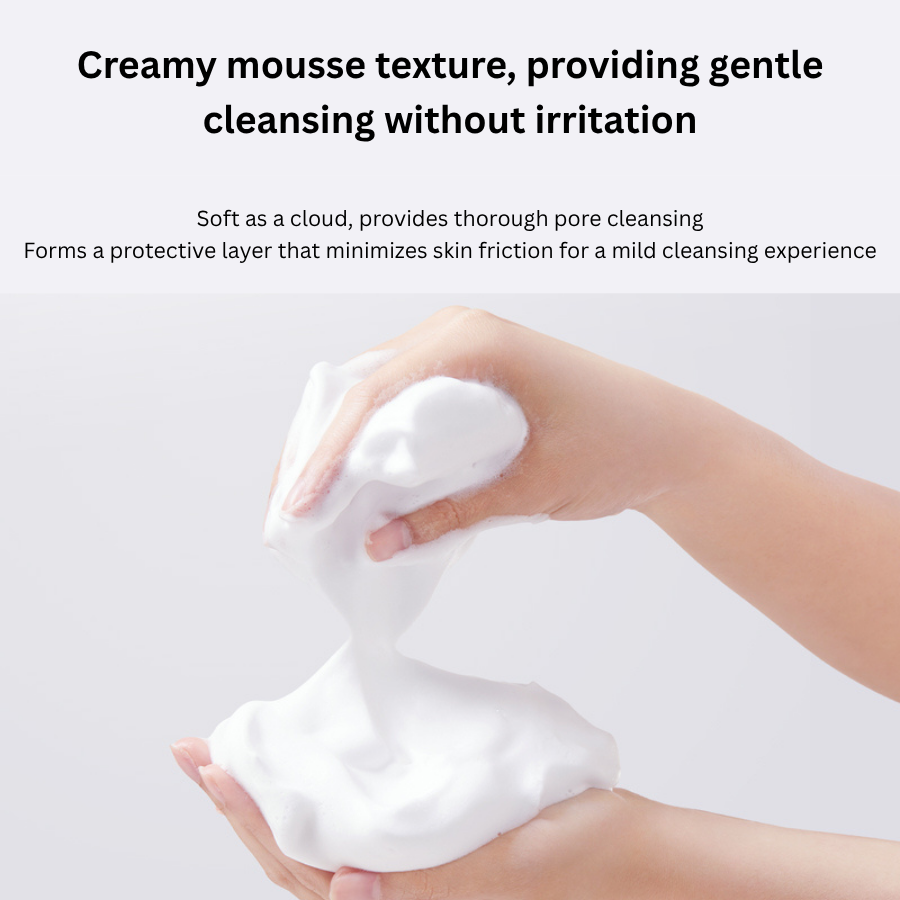 Use fingertips to massage the mousse in circular motions for about 30–60 seconds to dissolve dirt and oil. -